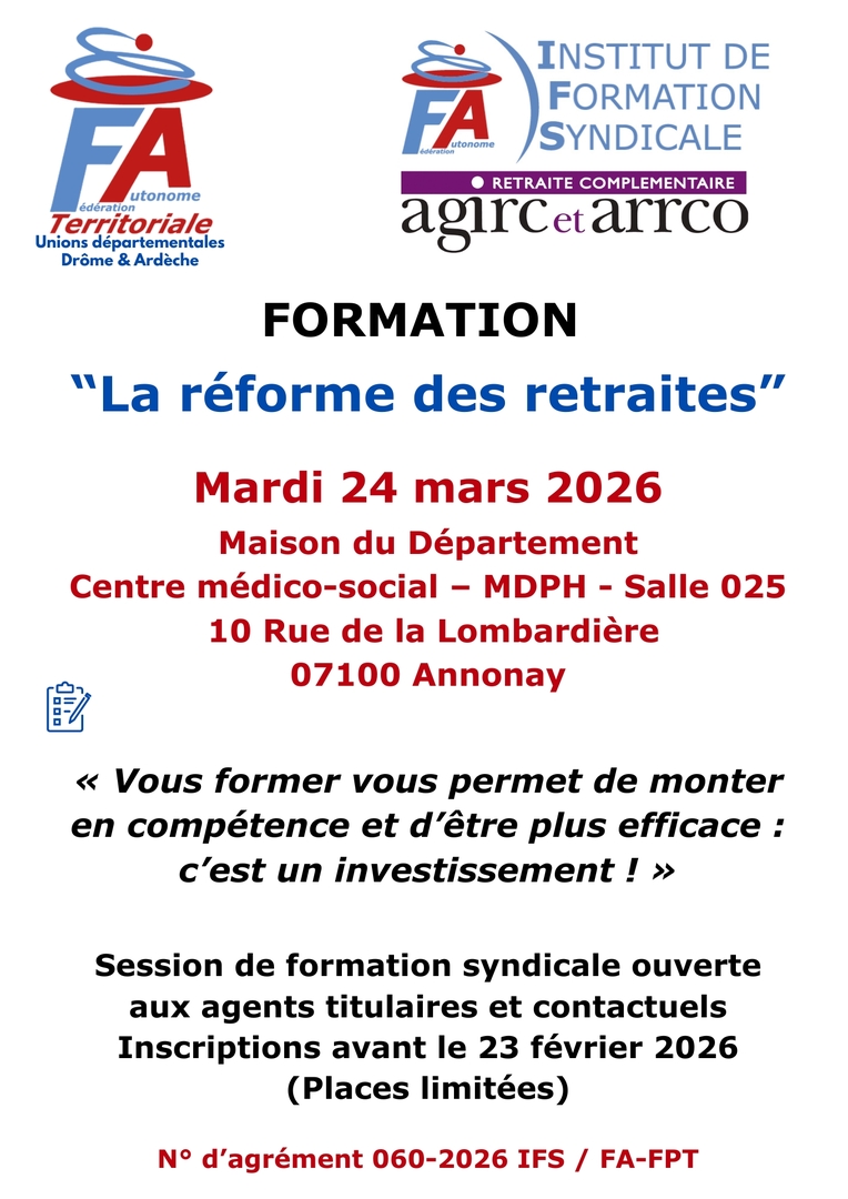 La formation "La réforme des retraites" aura lieu le 24 mars 2026 à Annonay.