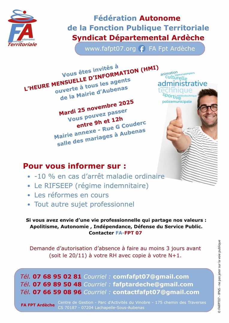 Le mardi 25 novembre, une délégation de la FA-FPT Ardèche ira à la rencontre des agents titulaires ou contractuels :