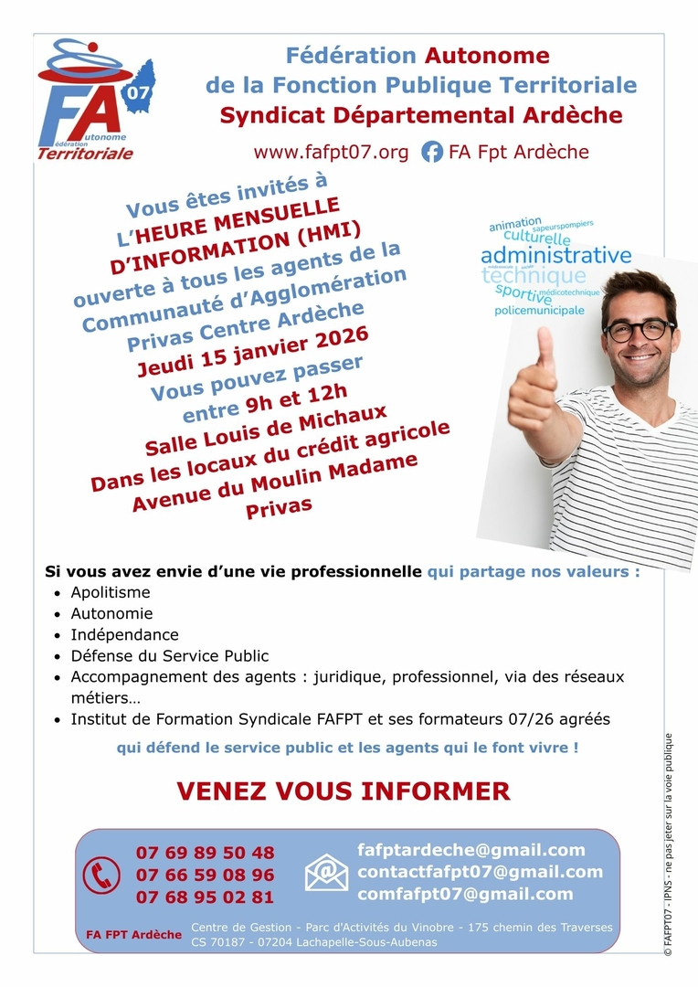 Le jeudi 15 janvier 2026, une délégation de la FA-FPT Ardèche ira à la rencontre des agents titulaires ou contractuels