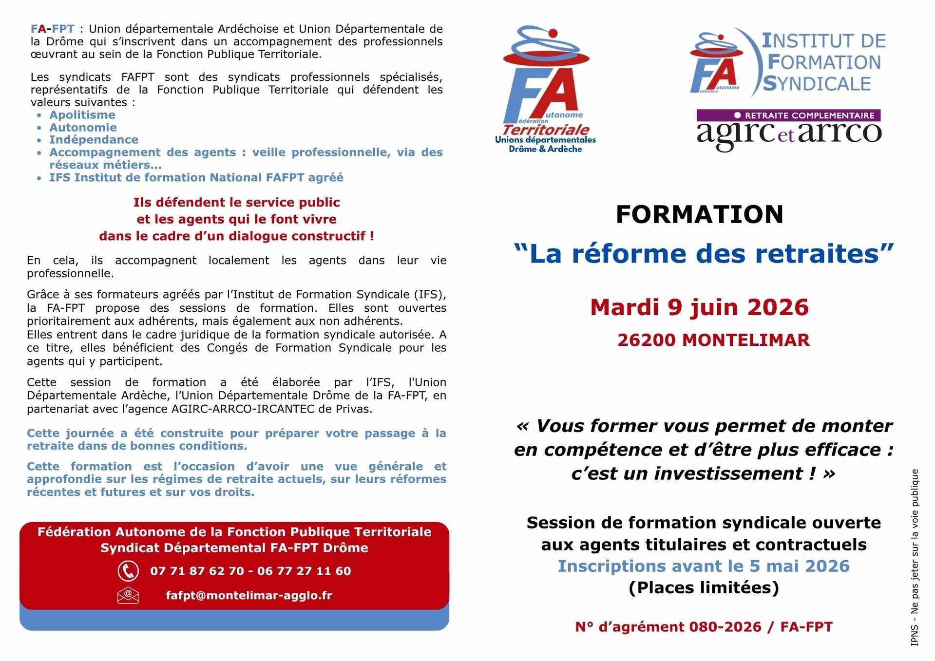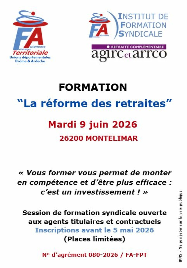 La formation "La réforme des retraites" aura lieu le 9 juin 2026 à Montélimar.